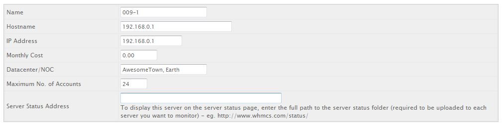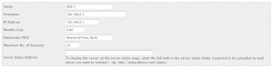 - Fill in the Name (*note* be sure this reflects the name you have setup within cacti!), Hostname, IP Address, Monthly Cost (if applicable), and Maximum Number of Accounts.
