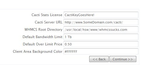 - You will then be taken to the End User License Agreement: Enter your Cacti Stats License Key and your Cacti Server URL. WHMCS is completed by default and you may edit the Default Bandwidth limit and Default Over Limit Price fields to suit your business needs.